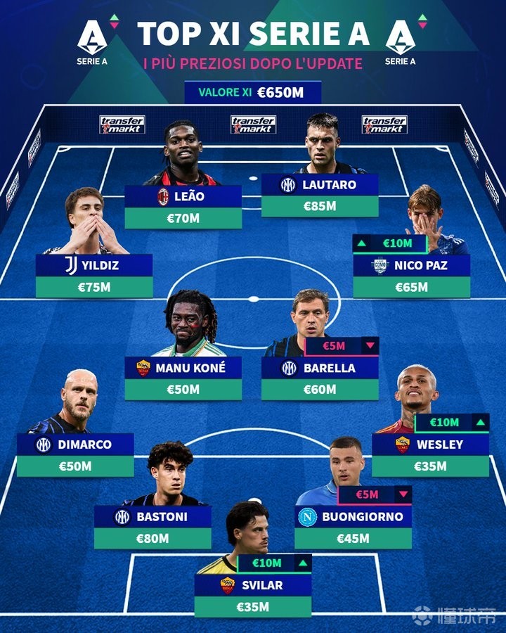 尼科-帕斯(科莫)6500万欧元(+1000万欧元)、巴雷拉(国际米兰)6000万欧元(-500万欧元)、夸迪奥-科内(罗马)5000万欧元、凯南-伊尔迪兹(尤文图斯)7500万欧元