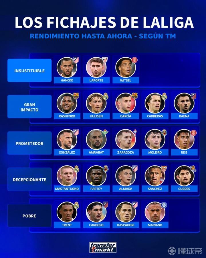 北京时间12月24日,德转对西甲今夏的几笔重要转会进行了评级,其中汉茨科、拉波尔特以及维特塞尔被评为无可替代,拉什福德、赫伊森等人被评为顶级,马斯坦托诺被评为令人失望,而亚历山大-阿诺德则被评为表现令人失望。