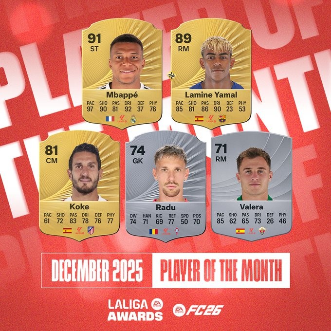 北京时间12月24日,西甲12月最佳球员候选名单公布,这5名球员为姆巴佩、亚马尔、科克、拉杜、巴莱拉。本月评选范围为联赛第15-17轮。