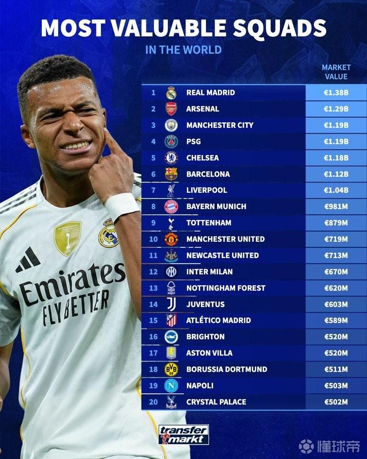 北京时间12月24日,德国转会市场列举了目前全世界总身价最高的球队Top20,其中皇马以13.8亿欧元居首,阿森纳以12.9亿欧元排名第二,曼城和巴黎以11.9亿欧元排在第三。