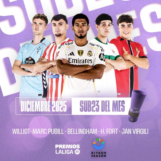 北京时间12月24日,西甲官方公布了12月最佳U23球员的候选名单,其中贝林厄姆、马克-普维尔、埃克托-福特等球员在列。