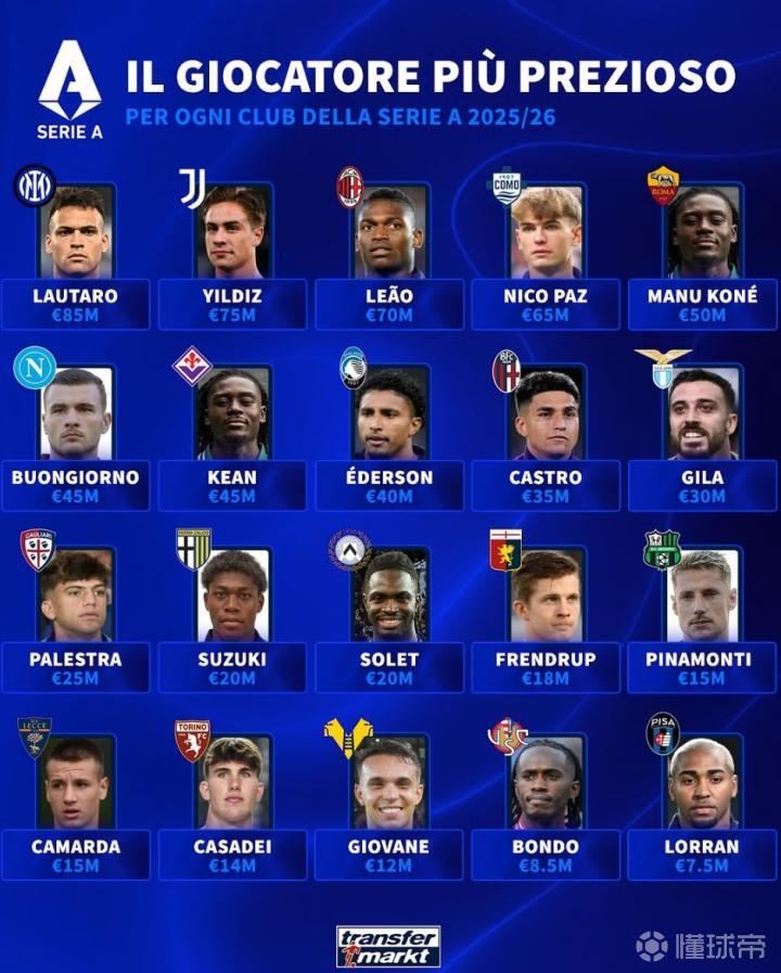 北京时间12月24日,在更新了意甲球员的身价之后,德转列出了意甲20家俱乐部各自身价最高的球员,国际米兰的劳塔罗以8500万欧元领衔,比萨全队身价最高的巴西19岁中场洛兰以750万欧元排名垫底。