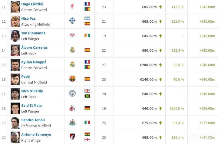 15. 姆巴佩(皇家马德里) +4000万欧元(+25%) 2亿欧元
