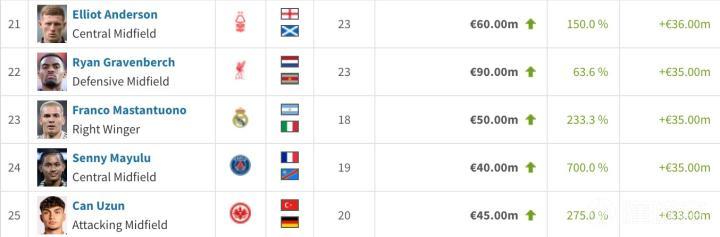 21. 埃利奥特-安德森(诺丁汉森林) +3600万欧元(+150%) 6000万欧元