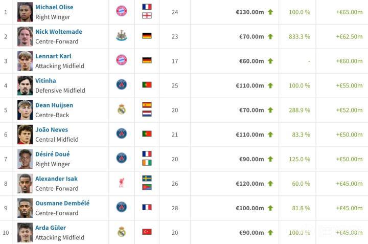 7. 杜埃(巴黎圣日耳曼) +5000万欧元(+125%) 9000万欧元