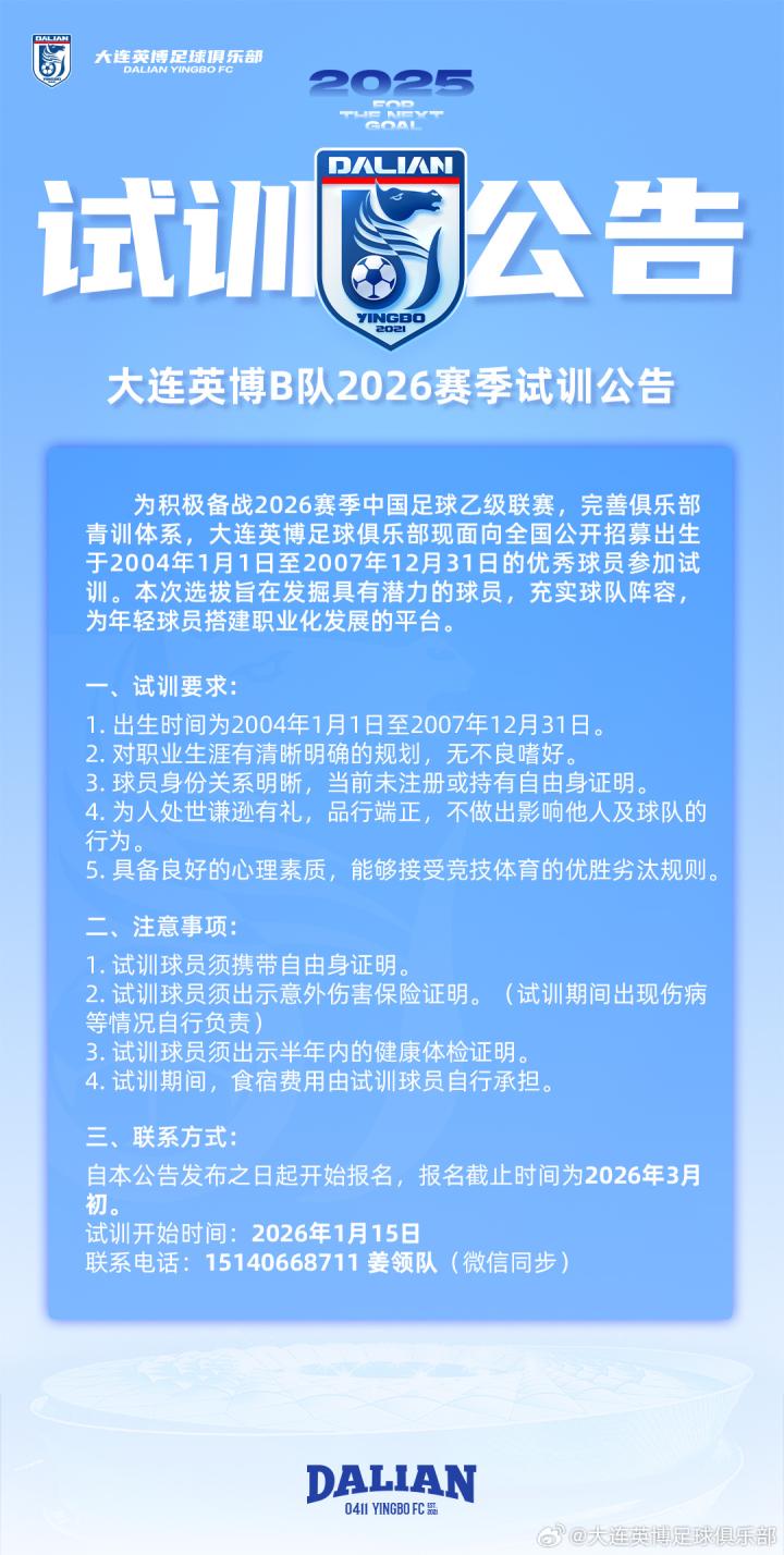 北京时间12月25日,大连英博官方发布了新赛季B队的试训公告,新赛季大连英博B队将征战中乙联赛。