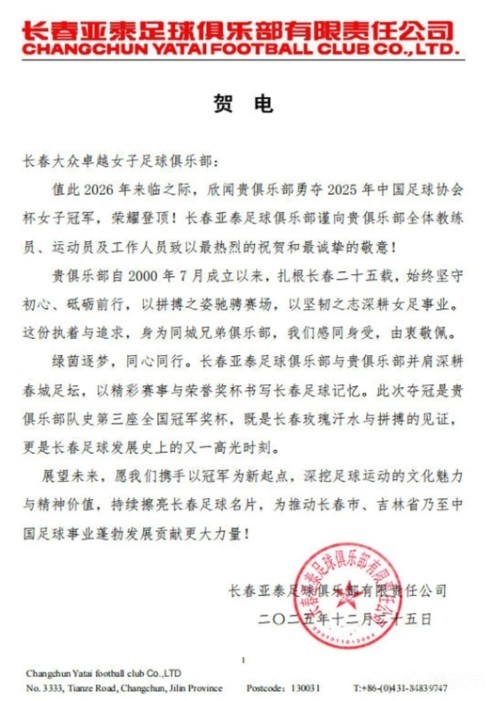 值此2026年来临之际,欣闻贵俱乐部勇夺2025年中国足球协会杯女子冠军,荣耀登顶!长春亚泰足球俱乐部谨向贵俱乐部全体教练员、运动员及工作人员致以最热烈的祝贺和最诚挚的敬意!贵俱乐部自2000年7月成立以来,扎根长春二十五载,始终坚守初心、砥砺前行,以拼搏之姿驰骋赛场,以坚韧之志深耕女足事业。这份执着与追求,身为同城兄弟俱乐部,我们感同身受,由衷敬佩。绿茵逐梦,同心同行。长春亚泰足球俱乐部与贵俱乐部并肩深耕春城足坛,以精彩赛事与荣誉奖杯书写长春足球记忆。此次夺冠是贵俱乐部队史第三座全国冠军奖杯,既是长春玫瑰汗水与拼搏的见证,更是长春足球发展史上的又一高光时刻。