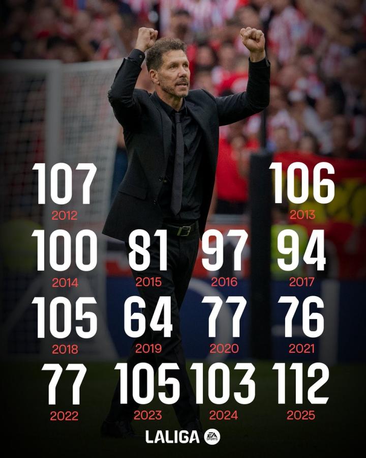 北京时间12月26日,来自西甲官方的统计指出,马德里竞技在2025年里各项赛事一共打进了多达112粒进球,这创造了自西蒙尼2011年12月接手球队以来,床单军团自然年正式比赛的进球数纪录。
