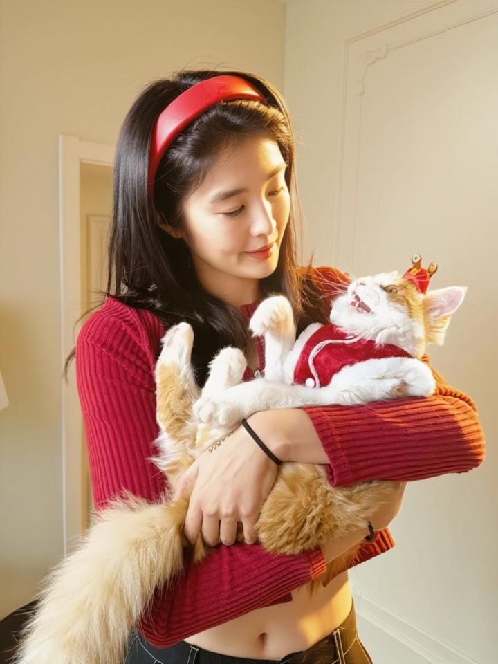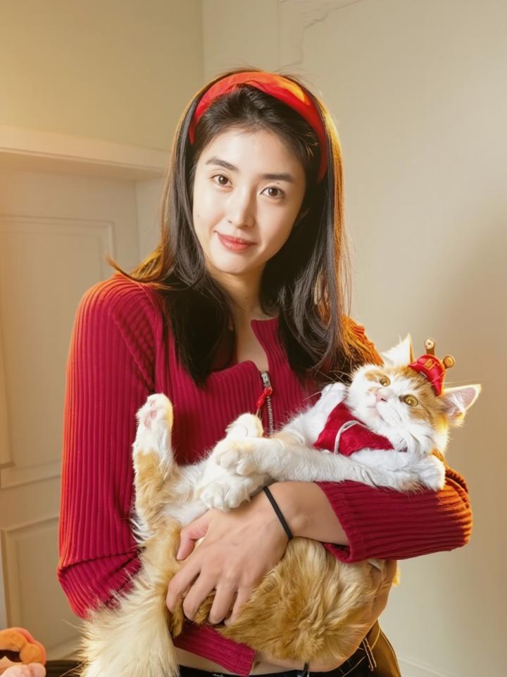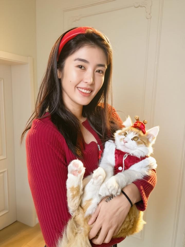 在照片中,赵丽娜穿着圣诞红的毛衣,戴着红色的发箍,怀里抱着小猫,也穿着红色喜庆的衣服和帽子。