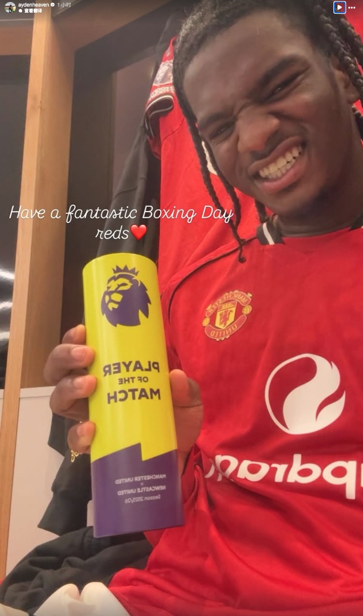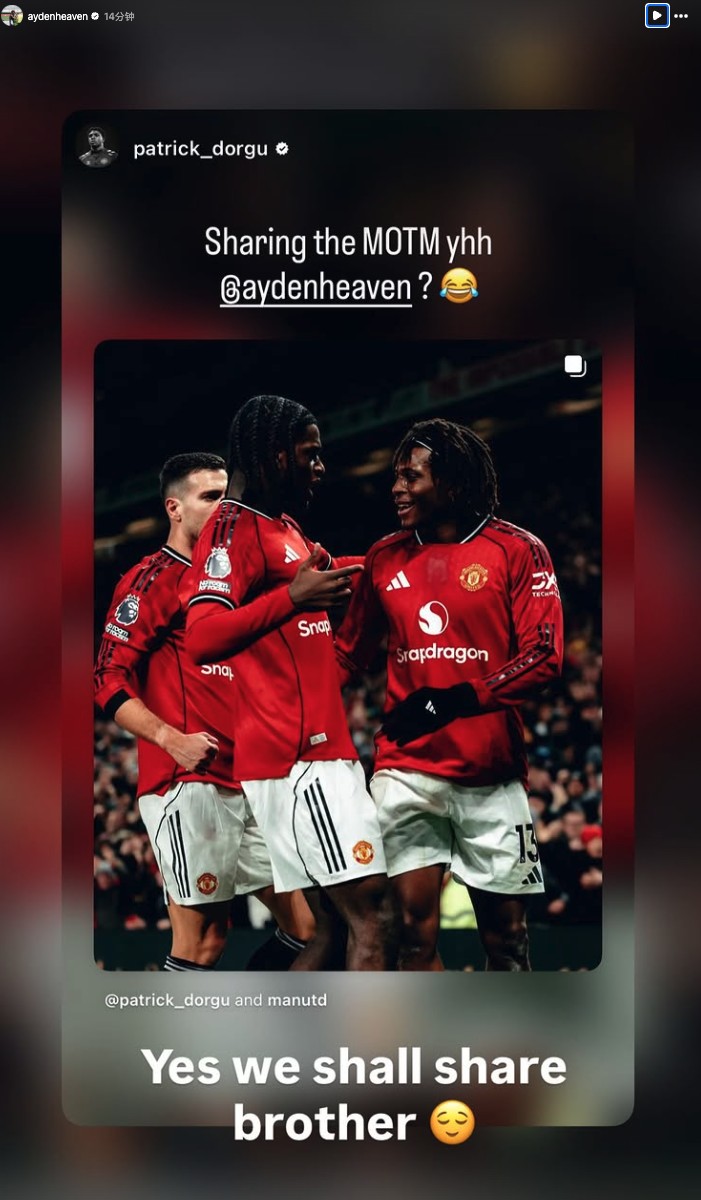 英超第18轮,曼联主场1-0击败纽卡斯尔联,此役表现出色的曼联后卫艾登-海文被现场评为全场最佳球员,并在社交媒体晒出了奖杯,多古在社交媒体询问是否可以分享全场最佳,海文回复道:“当然。”