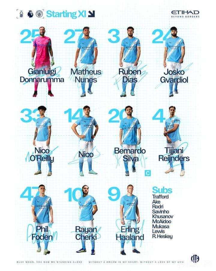 曼城首发:25-多纳鲁马、27-努内斯、3-鲁本-迪亚斯、24-格瓦迪奥尔、33-奥赖利、14-尼科-冈萨雷斯、20-伯纳多-席尔瓦、4-赖因德斯、47-福登、10-谢尔基、9-哈兰德