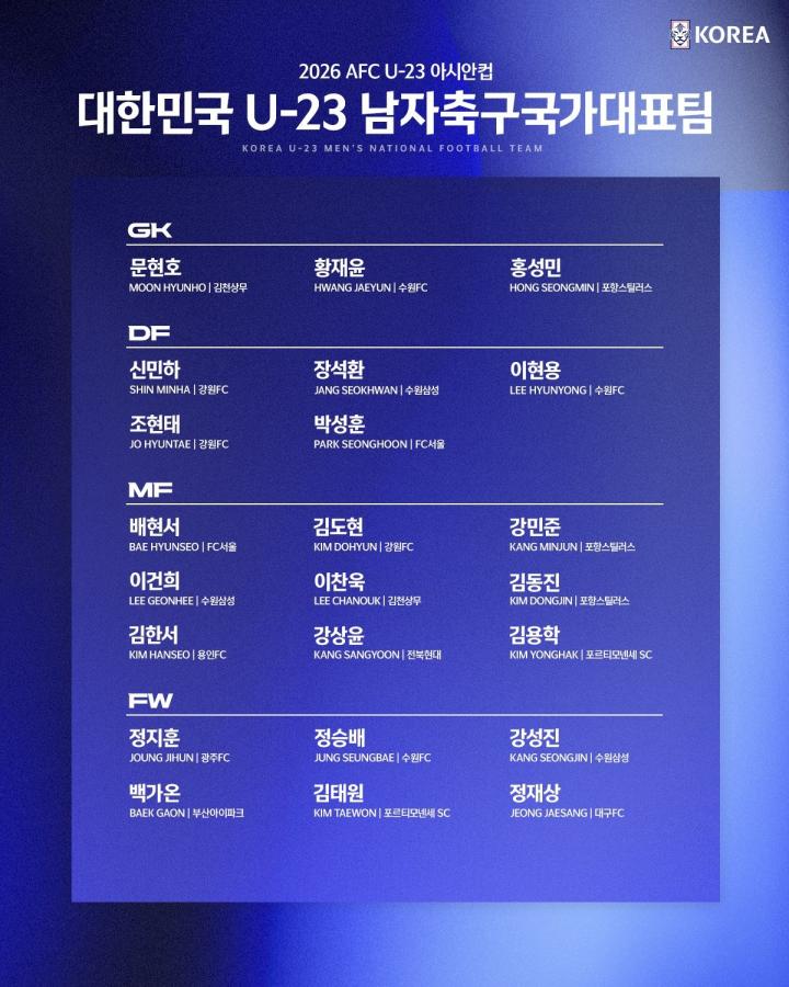 韩国足协公布了参加2026年U23亚洲杯的大名单,其中2名留洋球员入选,姜尚润、姜成真在列。