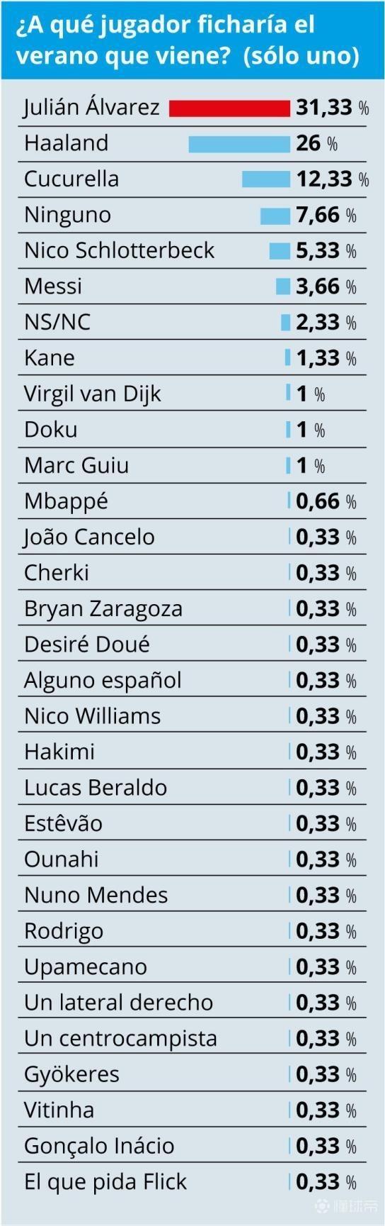 现效力于马德里竞技的阿根廷前锋阿尔瓦雷斯以31.33%的得票率高居榜首,成为巴萨会员最希望签下的球员。这位射手得票率比第二名哈兰德高出超5个百分点,哈兰德的支持率为26%。