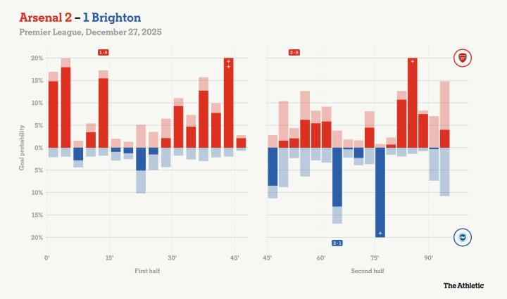 阿尔特塔断言阿森纳本该终结比赛悬念,这是正确的。他的球队射门数以24比8遥遥领先,这反映在下方的进球概率图中,该图使用了包括预期进球值在内的多种指标。
