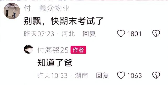《扬子晚报》报道,永州队夺得2025“湘超”冠军后,永州队球员付海铭在社交媒体里晒出自己身穿冠军金衣、手拿金牌的照片。在评论区里,付海铭的父亲留言“提醒”:“别飘,快期末考试了。”