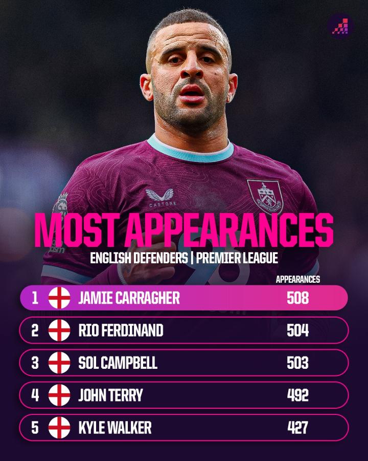据数据网站Opta Analyst的统计,在伯恩利对阵埃弗顿的比赛中,沃克完成了个人第427次英超出场,超越索斯盖特,成为英超历史上出场次数第五多的英格兰后卫。