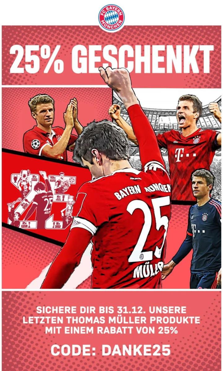 据《图片报》报道,自周日起,拜仁慕尼黑在官方线上球迷商店及线下门店,对俱乐部传奇球员托马斯-穆勒的球衣及相关商品提供25%折扣。球迷在结账时使用优惠码“DANKE25”即可享受优惠,该数字也对应穆勒曾在拜仁效力时期的球衣号码。