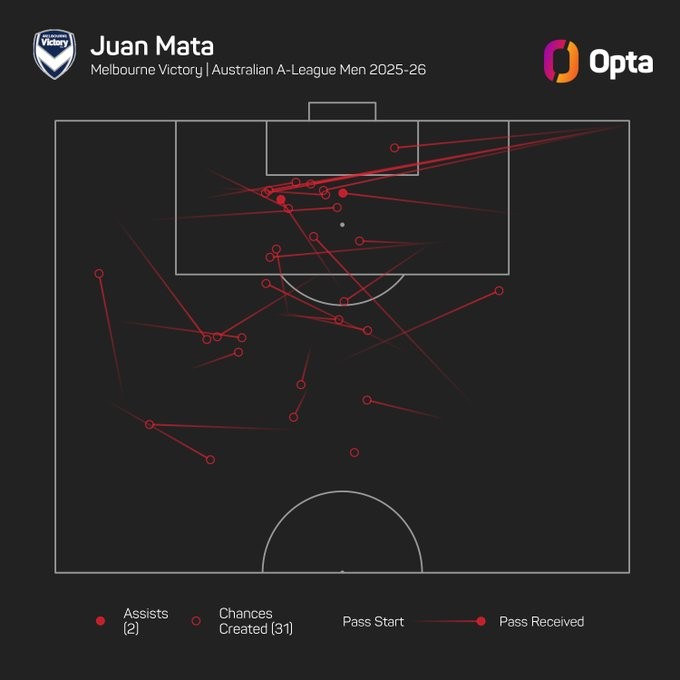 在2025/26赛季澳大利亚足球超级联赛中,效力于墨尔本胜利的胡安-马塔以每90分钟创造4.6次得分机会的效率,在总出场时间不少于90分钟的球员中高居联赛首位。
