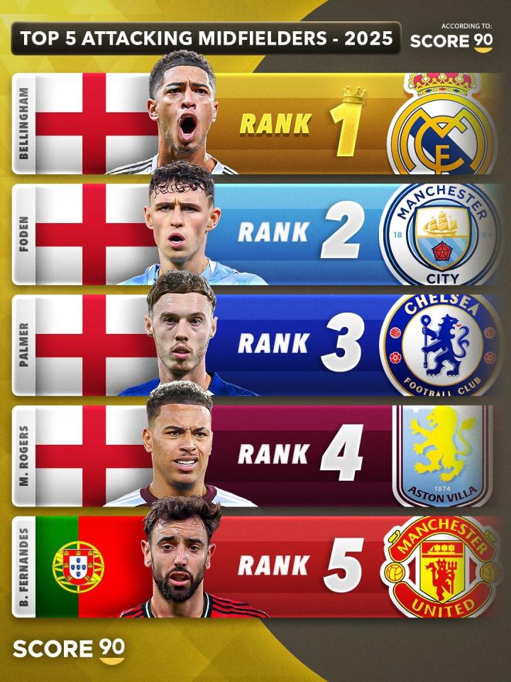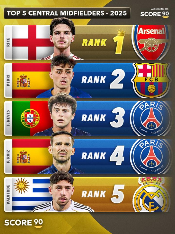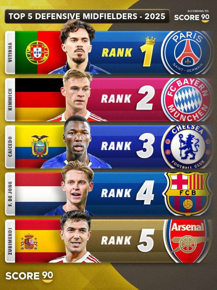 北京时间12月31日,Score90公布了根据他们的数据统计选出的2025年五大中场,其中防守型中场第一是维蒂尼亚,中场第一是赖斯,攻击型中场第一是贝林厄姆。