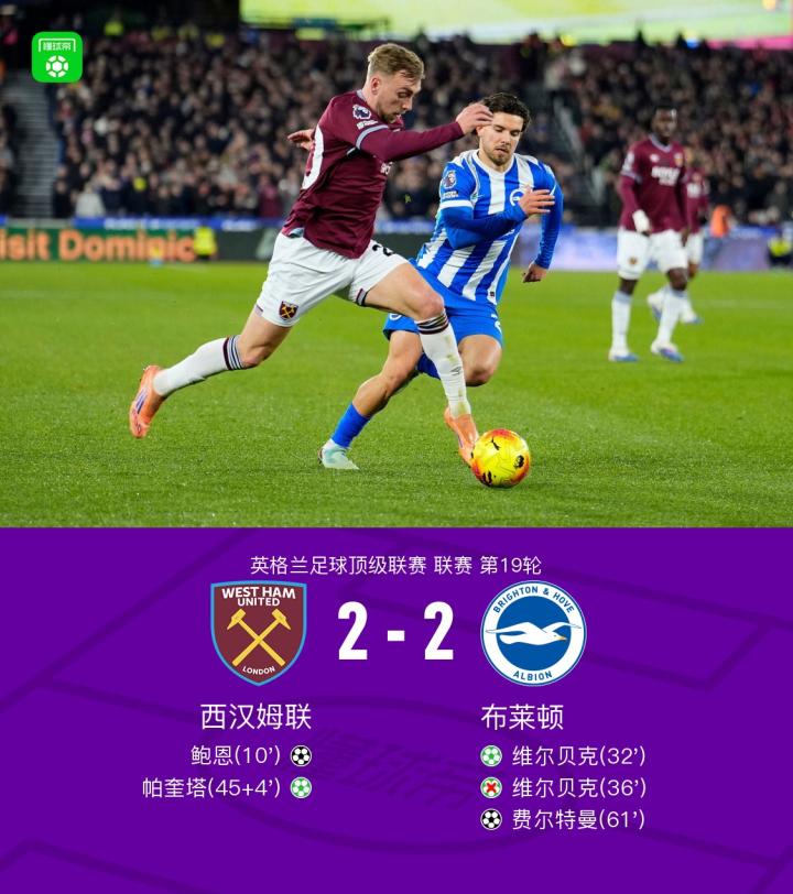 西汉姆联2-2布莱顿,帕奎塔传射+送点,维尔贝克点球二中一