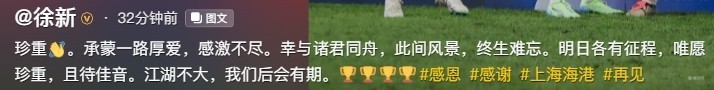 徐新写道:“珍重👋。承蒙一路厚爱,感激不尽。幸与诸君同舟,此间风景,终生难忘。明日各有征程,唯愿珍重,且待佳音。江湖不大,我们后会有期。🏆🏆🏆🏆”