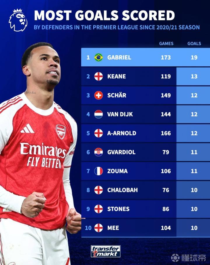 北京时间12月31日,德转统计了自2020-21赛季以来英超后卫进球榜,加布里埃尔以19球高居第一,范戴克、亚历山大-阿诺德、格瓦迪奥尔、查洛巴以及斯通斯上榜。