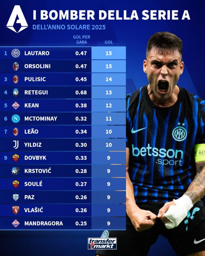 北京时间12月31日,德转列出了2025年意甲射手榜前10,劳塔罗和奥尔索利尼同以15球并列第一,普利希奇14球第三,麦克托米奈、莱奥、凯南-伊尔迪兹以及尼科-帕斯上榜。