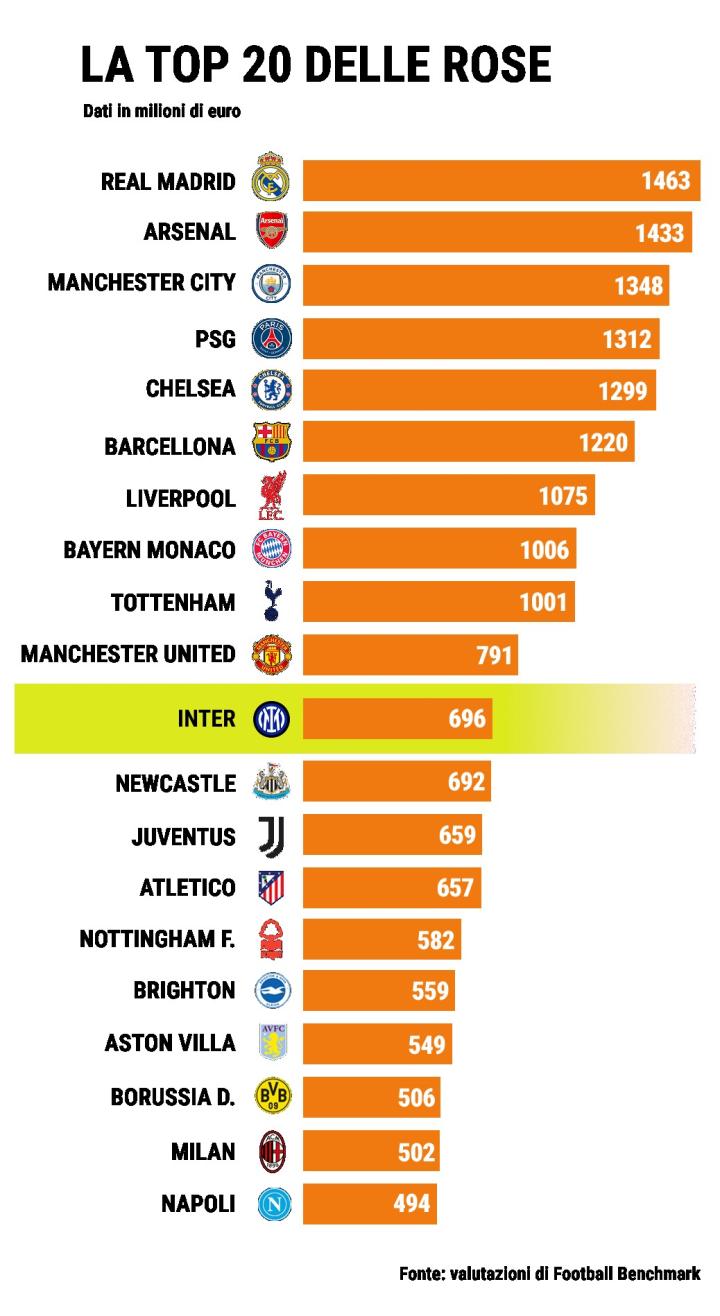 在欧洲范围内,阵容估值排名榜首的是皇家马德里,达到14.63亿欧元,其后分别是阿森纳的14.33亿欧元和曼城的13.48亿欧元。此外,还有巴黎圣日耳曼、切尔西、巴塞罗那、利物浦、拜仁和托特纳姆等六支球队,阵容价值同样超过10亿欧元。橡树资本希望,国际米兰能够跻身这一行列。
