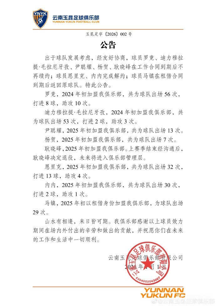 北京时间1月1日,云南玉昆官方宣布,恩里克、内内、罗竞、迪力穆拉提-毛拉尼牙孜、尹聪耀、杨贺、马镇离队,耿晓峰退役,未来将进入俱乐部管理层。