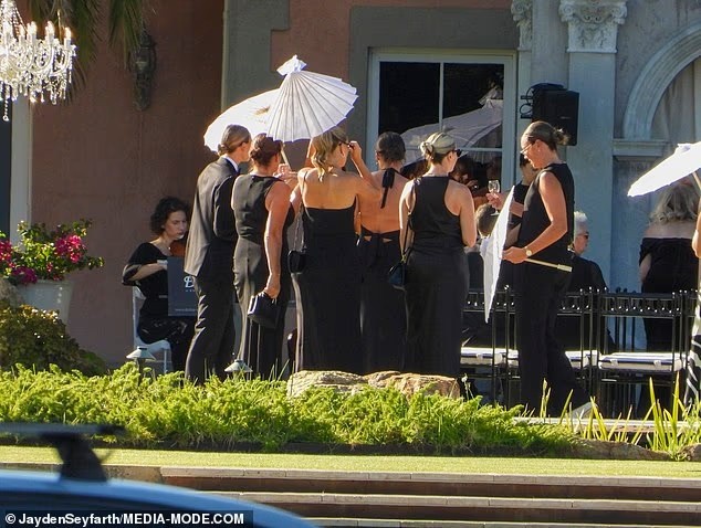 在珀斯酷热难耐的35度高温下,婚礼宾客们聚集在婚礼场地外,其中包括多位澳大利亚橄榄球队员的明星,共同举杯祝贺这对新人。