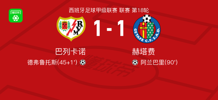 巴列卡诺1-1赫塔费,德弗鲁托斯首开记录,阿兰巴里救主