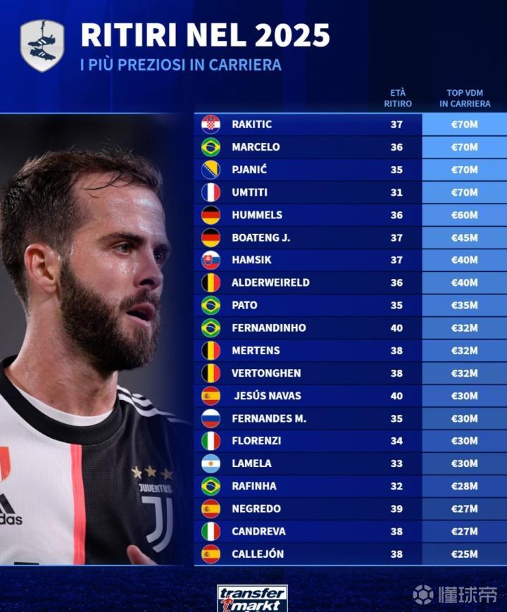 北京时间1月3日,德转列出了2025年退役球员历史身价前20,拉基蒂奇、马塞洛、皮亚尼奇以及乌姆蒂蒂7000万欧元并列第一。