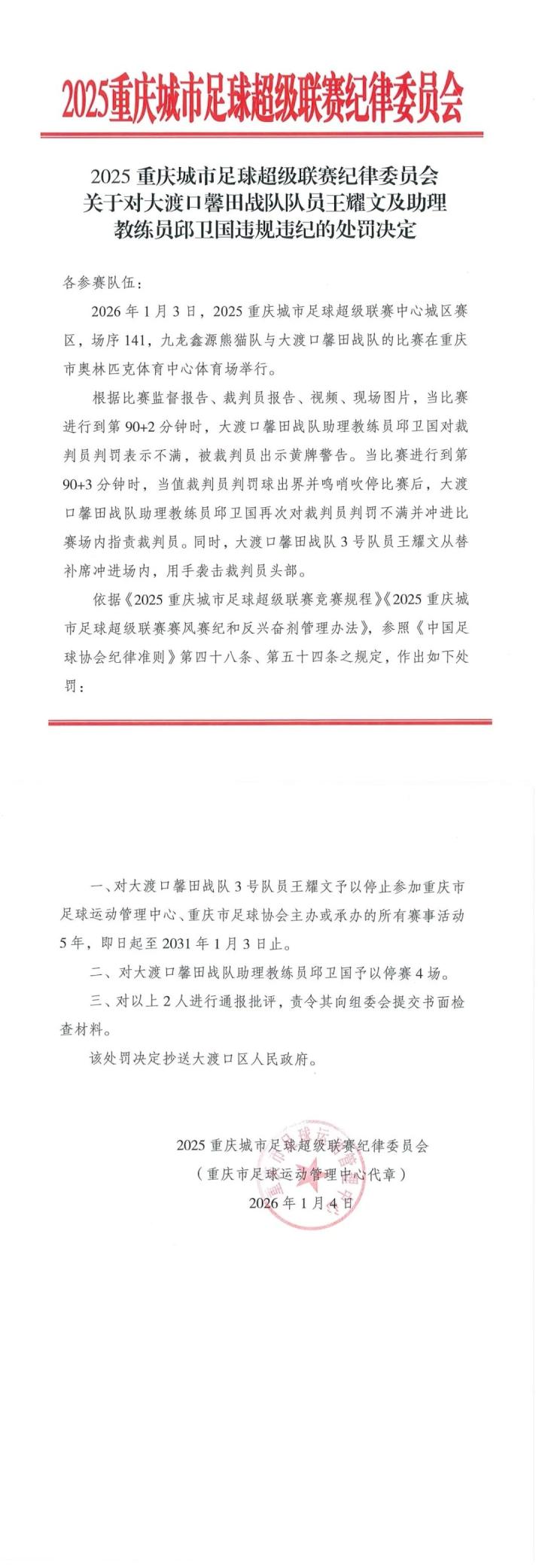 1月4日,2025重庆城市足球超级联赛通报:关于对大渡口馨田战队队员王耀文及助理教练员邱卫国违规违纪的处罚决定。