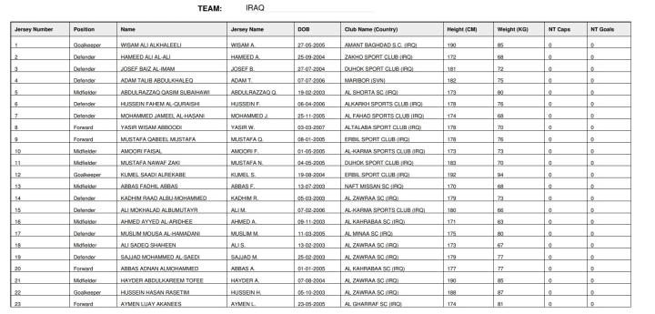 守门员:1-维萨姆-阿里(巴格达市政)、12-库梅勒-雷卡贝(埃尔比勒)、22-侯赛因-哈桑(祖拉)
