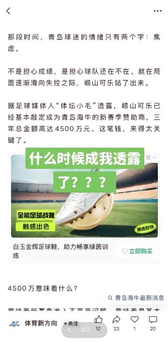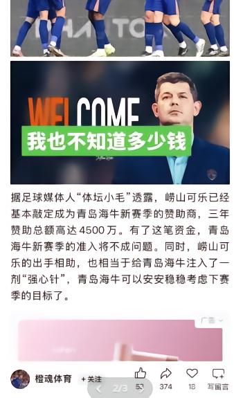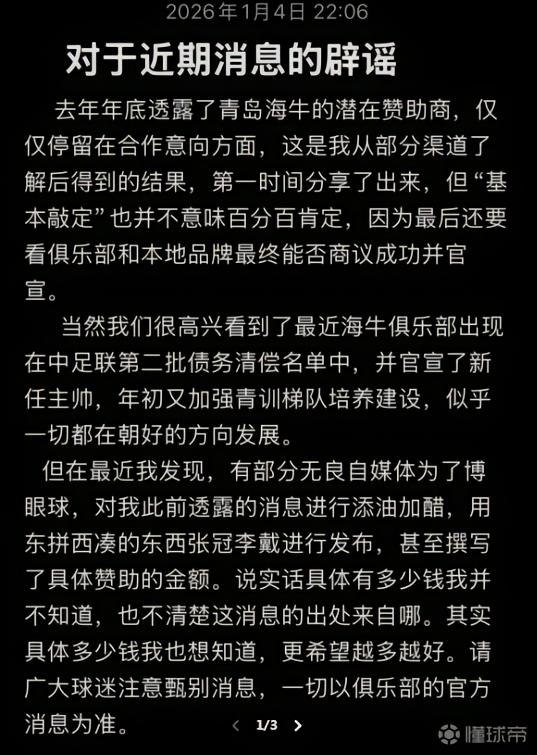 针对近期部分自媒体发布有关青岛海牛新赞助商的“报道”,媒体人“体坛小毛”进行了辟谣:“球迷注意甄别,部分自媒体张冠李戴!‘基本敲定’并不意味百分百肯定,因为最后还要看俱乐部和本地品牌(指崂山可乐)最终能否商议成功并官宣。”