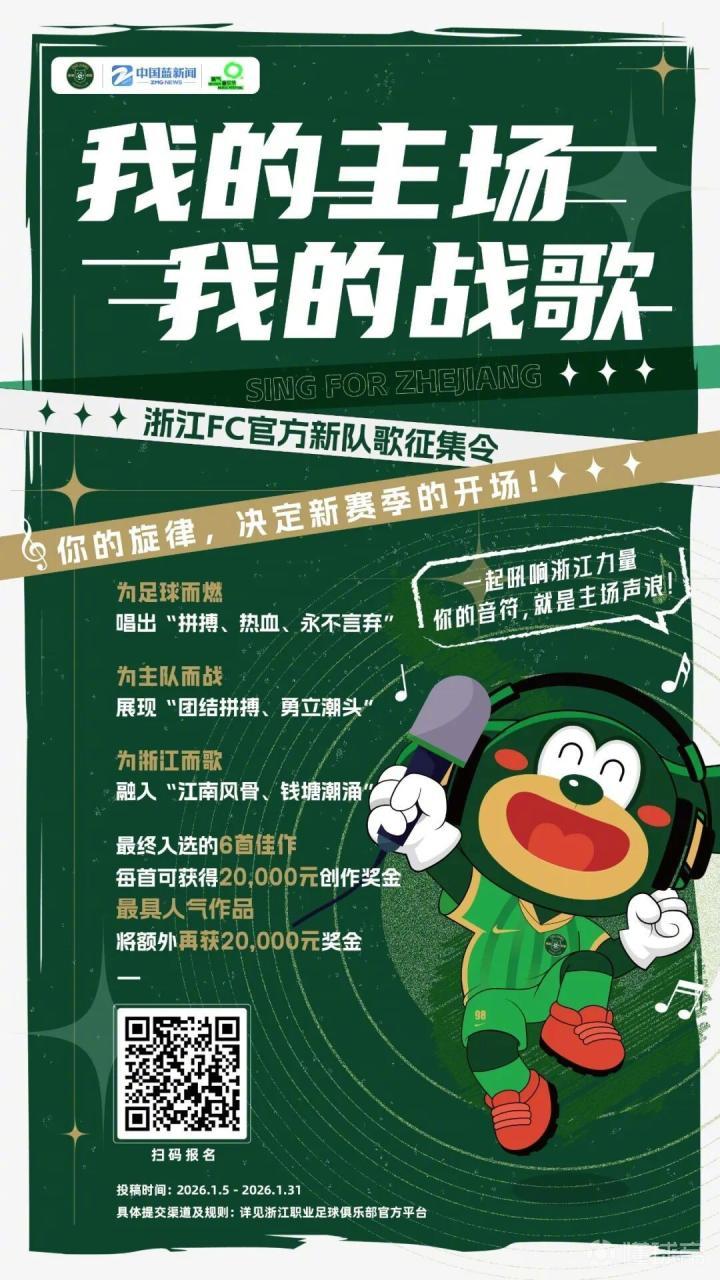 经过2025赛季中超联赛浙江FC主场“音乐季”的预热和酝酿,原创音乐的魅力和价值已经深入人心。为进一步打造浙江足球氛围,响应公众参与热情,本次新队歌征集计划于2026年1月初启动,2026年2月底完成6首入围歌曲的征集、评选和制作,在中超2026新赛季正式推出,并开始线上线下、全网、多渠道的推广。2026赛季期间综合评估6首入围歌曲的受欢迎程度,选择其中一首作为主打队歌。