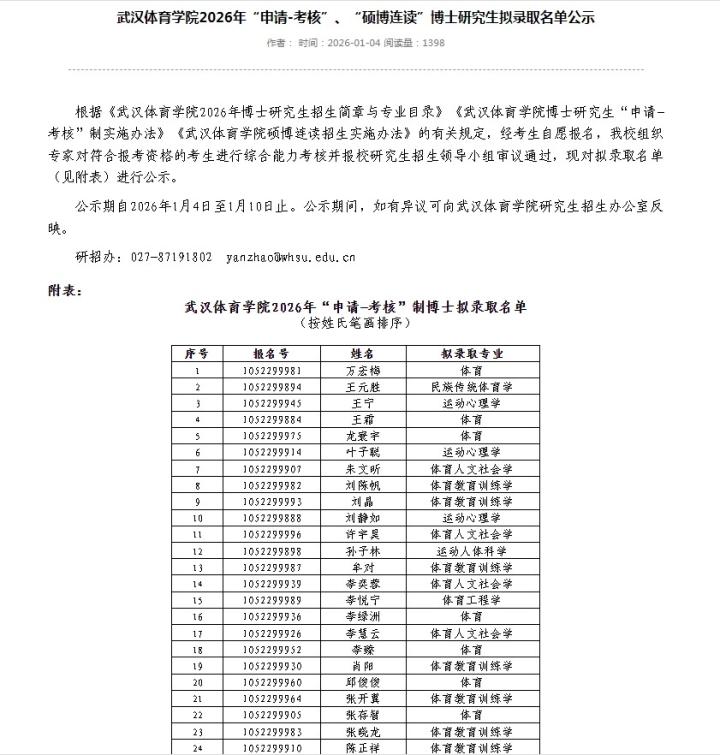 九派新闻报道,根据武汉体育学院研究生院官网1月4日发布的公示显示,中国女足国脚王霜进入该校2026年“申请-考核”制博士拟录取名单,拟录取专业为体育。