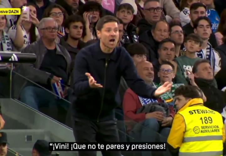 比赛进行到第67分钟(当时比分为3-1),转播镜头捕捉到阿隆索因不满维尼修斯在前场逼抢皇家贝蒂斯出球时的投入程度而显得情绪激动。他从技术区向这位巴西边锋大声喊话,要求其施加更大压力。