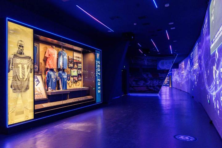 “申花中心”由三大功能板块有机融合,为访客提供构建沉浸式足球文化体验。作为项目的灵魂所在,申花文化体验中心通过长达50米的“申花之路”互动长廊、360度环幕沉浸的“巅峰时刻”影厅、结合红外感应与体感技术的“群星闪耀”及“功勋教练”互动展区,通过科技手段将申花俱乐部三十余年历史转化为可触摸、可交互的生动叙事。特别设立的“第十二人”球迷文化展区,集中展现了俱乐部与球迷风雨同舟的深厚情感。