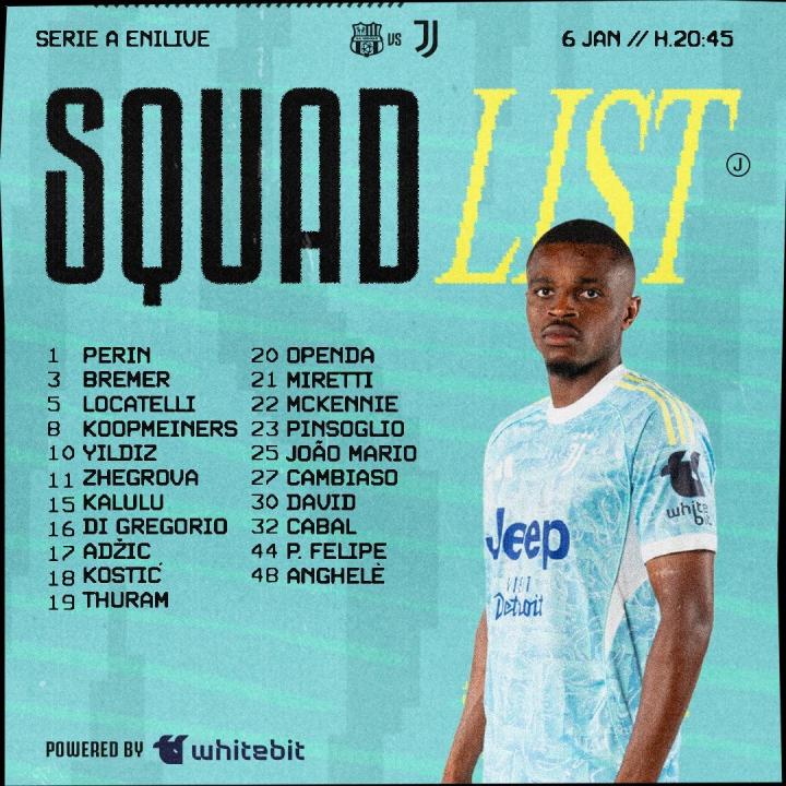 北京时间1月6日,尤文图斯官方公布了意甲第19轮客场对阵萨索洛的大名单。