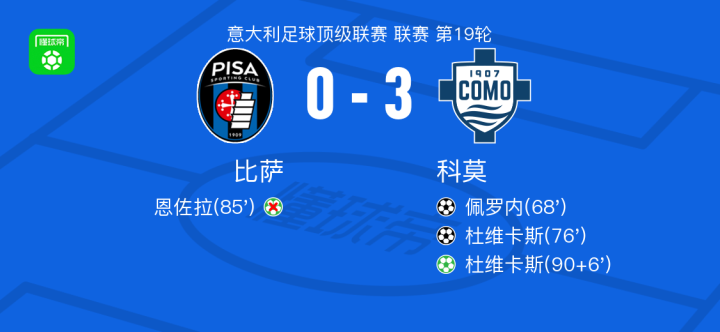 科莫3-0大胜比萨,杜维卡斯梅开二度,佩罗内破门