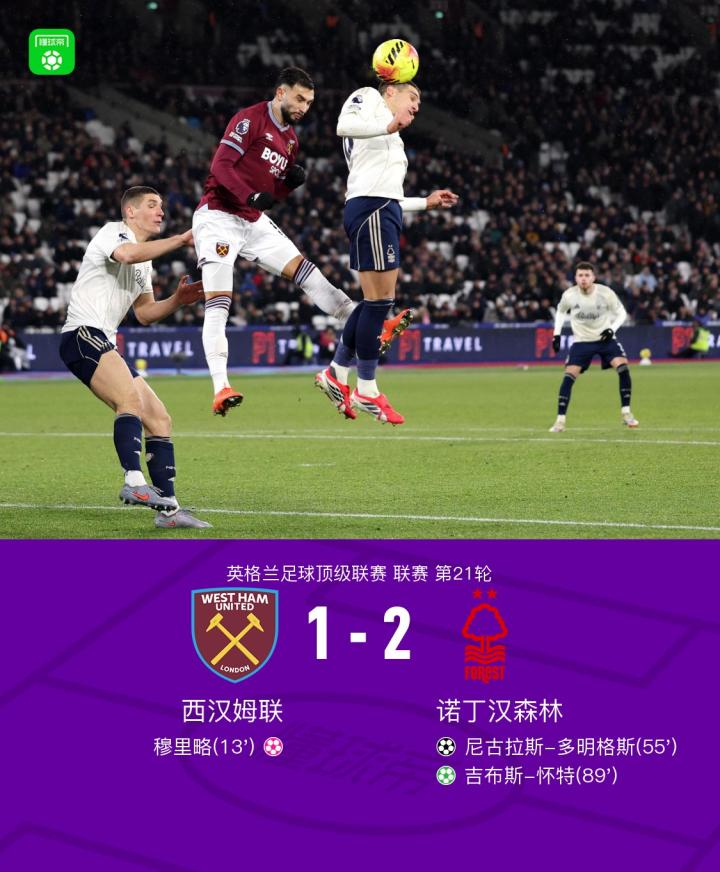诺丁汉森林2-1逆转西汉姆联,多明格斯破门,吉布斯-怀特点射,穆里略乌龙