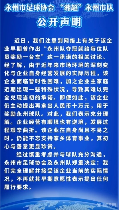 然而,永州市足球协会、“湘超”永州市队的公开声明又揭开了事件的另一面:在球队起步艰难时,该企业主就雪中送炭捐赠10万元;在自身陷入困境无法兑现承诺时,仍主动提出再拿出10万元用于奖励。