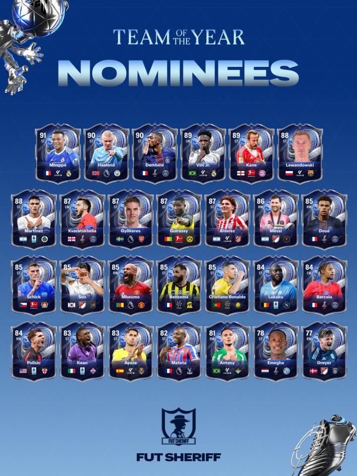 姆巴佩、哈兰德、登贝莱、维尼修斯、哈里-凯恩、莱万多夫斯基、劳塔罗-马丁内斯、克瓦拉茨赫利亚、哲凯赖什、吉拉西、胡利安-阿尔瓦雷斯、梅西、杜埃、希克、孙兴慜、姆伯莫、本泽马、C罗、卢卡库、巴尔科拉、普利希奇、莫伊塞-基恩、阿约塞-佩雷斯、马特塔、安东尼、埃梅加、德雷尔