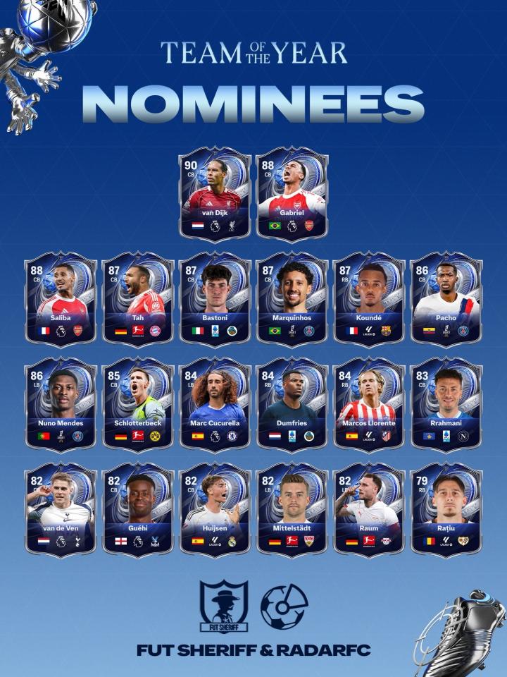 范戴克、加布里埃尔、萨利巴、约纳坦-塔、巴斯托尼、马尔基尼奥斯、孔德、威廉-帕乔、努诺-门德斯、施洛特贝克、库库雷利亚、邓弗里斯、马科斯-略伦特、阿米尔-拉赫马尼、范德芬、格伊、赫伊森、米特尔施泰特、劳姆、拉蒂乌
