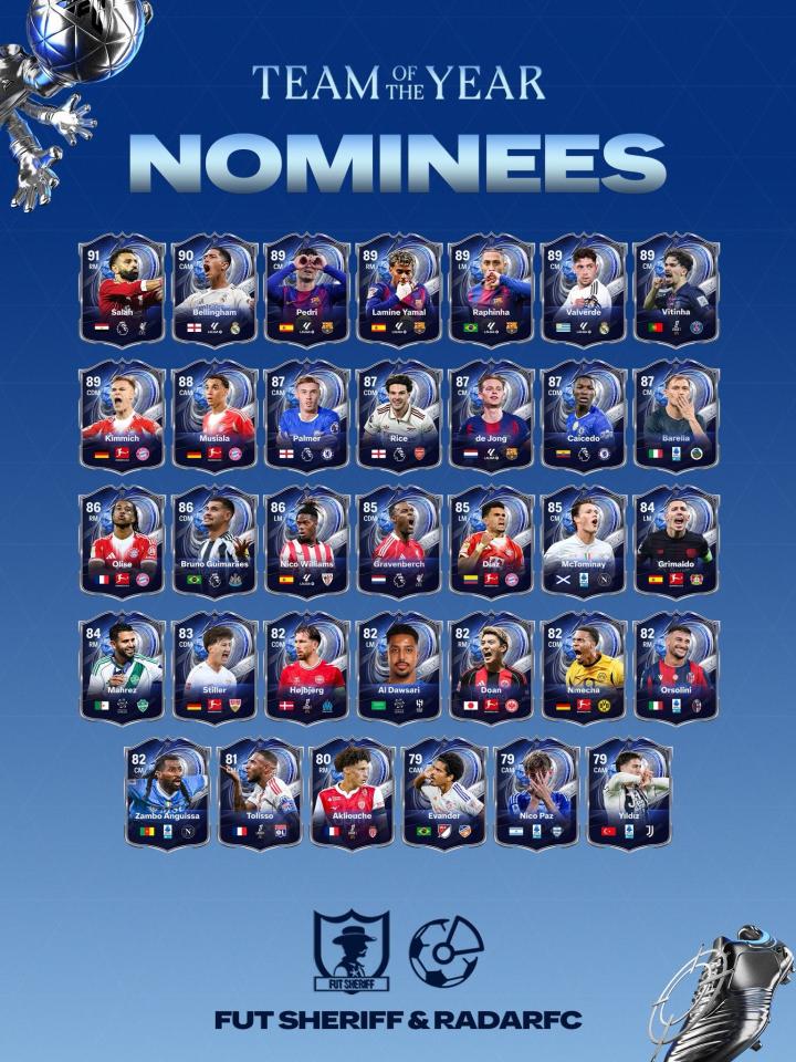 萨拉赫、贝林厄姆、佩德里、亚马尔、拉菲尼亚、巴尔韦德、维蒂尼亚、基米希、穆西亚拉、帕尔默、赖斯、弗朗基-德容、莫伊塞斯-凯塞多、巴雷拉、奥利塞、吉马良斯、尼科-威廉斯、赫拉芬贝赫、路易斯-迪亚斯、麦克托米奈、格里马尔多、马赫雷斯、施蒂勒、赫伊别尔、萨勒姆-达瓦萨里、堂安律、费利克斯-恩梅加、奥尔索利尼、安古伊萨、托利索、阿克利乌什、伊万德、尼科-帕斯、凯南-伊尔迪兹