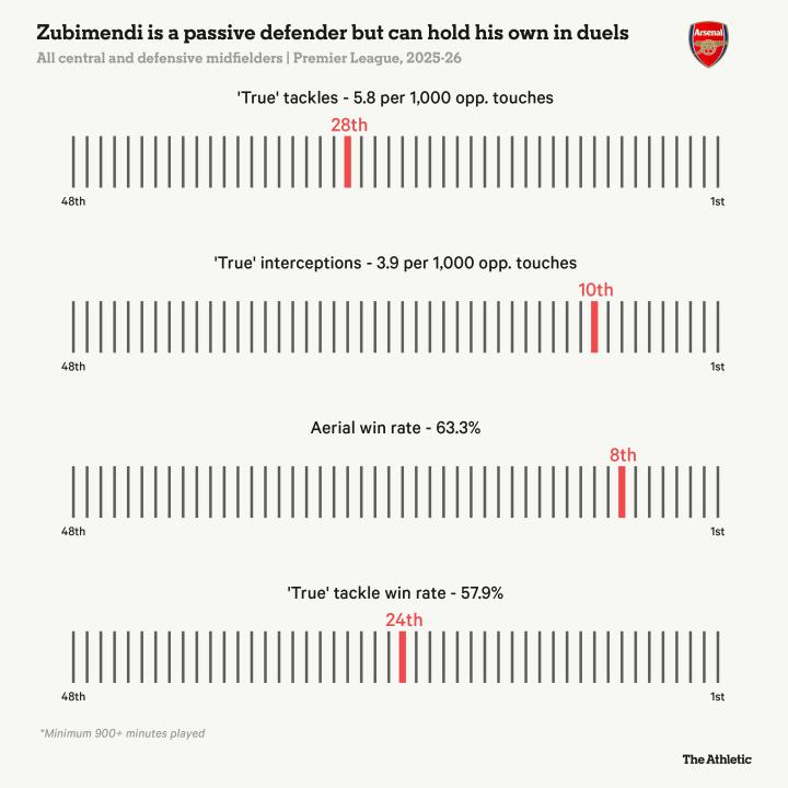 在他的处子赛季刚过半程之际,在所有为阿森纳在各赛事中出场至少900分钟的球员中,苏比门迪的场均抢断次数(每90分钟1.5次)排名第六,拦截次数(每90分钟1.2次)排名第二。
