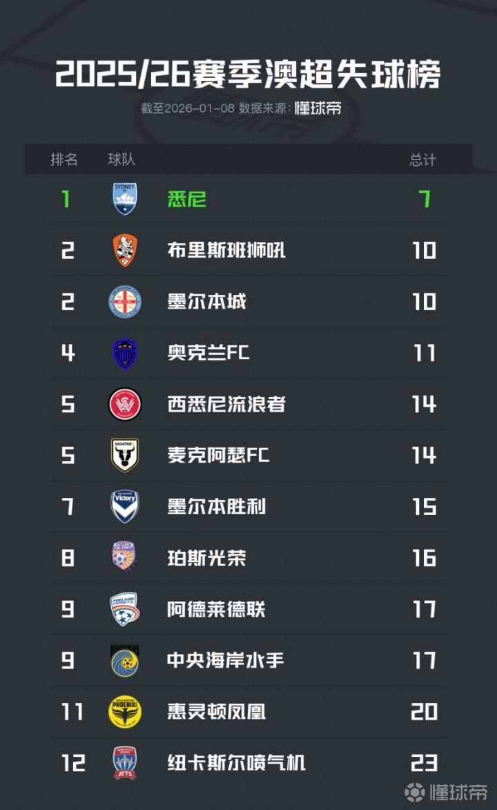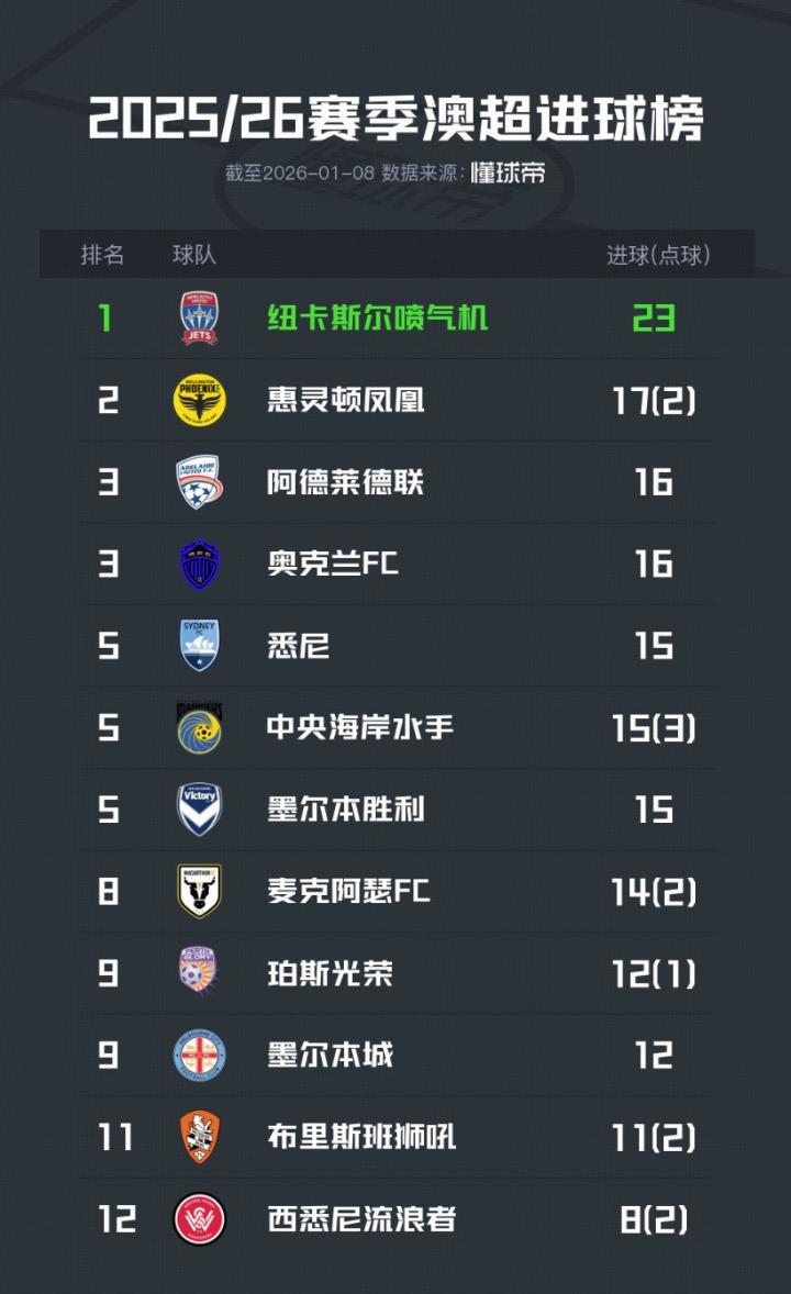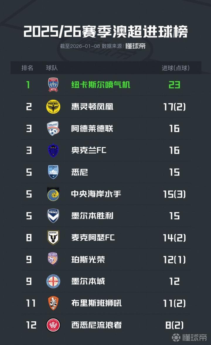北京时间1月8日,澳超大多数球队已进行了11轮联赛。悉尼队少赛一轮,麦克阿瑟FC、布里斯班狮吼、墨尔本城多赛一轮。目前纽卡斯尔喷气机进23球、丢23球,两项数据均暂列澳超最高。