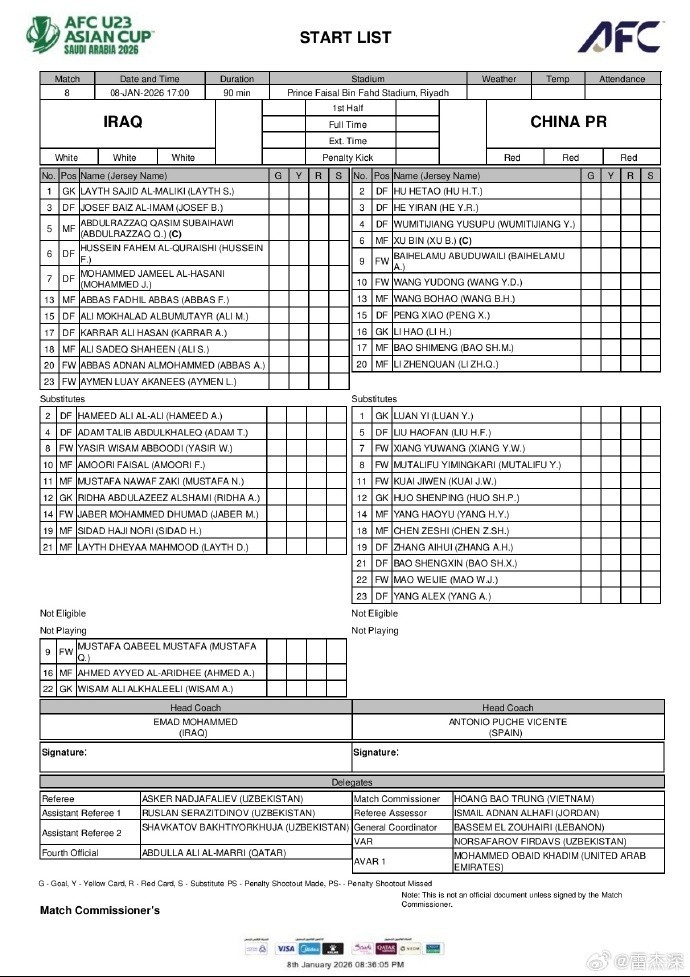 不过,从比赛日公布的官方报名信息来看,伊拉克U23队本场比赛最终仅报20人名单,人员确实未能满额,这也意味着伊拉克主帅此前的说法并非“烟雾弹”,球队确实遭遇了一定程度的减员。