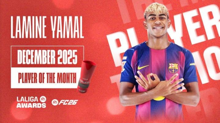 亚马尔在11月当选西甲月度最佳球员后,12月再度获得该项荣誉。过去一个月,他在多场比赛中扮演关键角色,帮助巴塞罗那在2025年最后一个月的四场比赛中全部取胜。